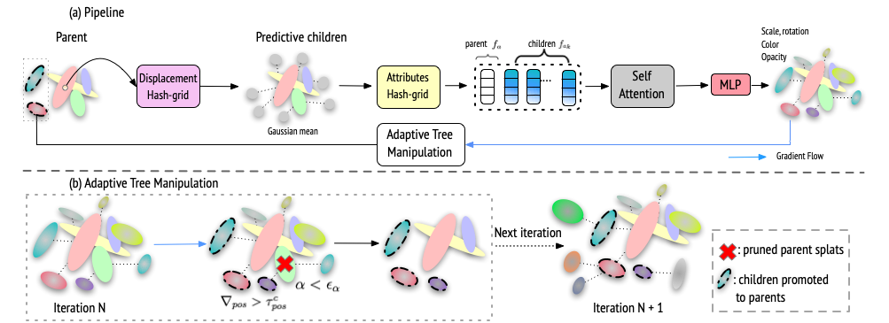 Recent approaches representing 3D objects and scenes using Gaussian splats show increased rendering speed across a variety of platforms and devices. While ren- dering such representations is indeed extremely efficient, storing and transmitting them is often prohibitively expensive. To represent large-scale scenes, one often needs to store millions of 3D Gaussian, which can occupy up to gigabytes of stor- age. This creates a significant practical barrier, preventing widespread adoption on resource-constrained devices. In this work, we propose a new representation that dramatically reduces the hard drive footprint while featuring similar or improved quality when compared to the standard 3D Gaussian splats. This representation leverages the inherent feature sharing among splats in the close proximity using a hierarchical tree structure, with which only the parent splats need to be stored. We present a method for constructing tree structures from naturally unstructured point clouds. Additionally, we propose the adaptive tree manipulation to prune the redundant trees in the space, while spawn new ones from the significant children splats during the optimization process. On the benchmark datasets, we achieve 20x storage reduction in hard-drive footprint with improved fidelity compared to the vanilla 3DGS and 2x-5x reduction compared to the exiting compact solu- tions. More importantly, we demonstrate the practical application of our method in real-world rendering on mobile devices and AR glasses